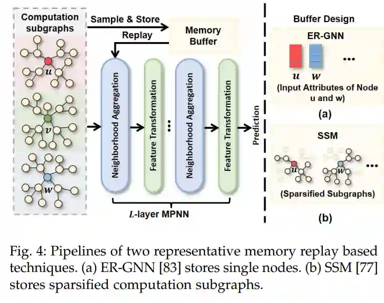 基于记忆回放的方法通过使用来自先前任务的代表性数据重新训练模型来防止遗忘。传统的持续学习方法处理单个数据而不涉及交互,可以简单地采样并存储在缓冲区中。然而,对于图上的学习,基于记忆回放的方法将会遇到记忆爆炸的挑战[1]。在生成节点(一个数据点)的表示时,图神经网络(GNNs)通常会聚合来自多跳邻居的信息。因此,要重新生成单个节点的表示,就必须存储来自呈指数级扩展的邻域的信息。在密集图上,内存消耗很容易变得难以处理[1]。由于这个挑战,经验回放图神经网络(ER-GNN)[83](图4(a))选择忽略图拓扑,仅存储单个节点的属性以重新生成表示。