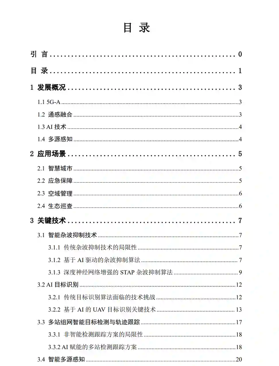 随着低空经济迈向规模化发展的新阶段,无人机(UAV)物流、城市空中交通、应急救援等新兴应用场景持续拓展。然而,应用场景的多元化与复杂化要求低空通感网络具备更强的稳定性、更高的精度及对不同场景的灵活适配能力。传统的非智能低空通感网络难以满足日益丰富的低空业务对安全性与高效性的需求。因此,亟需通过技术创新实现对低空网络的突破升级。 人工智能(AI)技术的快速发展为低空网络的升级带来了新契机。AI强大的学习与决策能力,使网络得以更好地适应动态变化的低空场景,有效解决了传统非智能通感技术在泛化能力和自适应调节等方面的不足。因此,开展智能低空通感网络相关技术的研究,是推动低空经济向智能化、高效化发展的必然选择,对构建安全、有序的低空生态具有重要的现实意义。 本白皮书首先阐述了智能低空通感网络的发展概况;其次介绍了智能低空通感网络的多种应用场景;随后针对应用场景所需的关键能力,分析了传统非智能通感技术面临的问题与挑战,进而提出创新性解决方案;在杂波抑制方面,提出了融合AI技术与传统算法的深度神经网络增强的空时自适应处理(STAP)算法,以实现智能杂波抑制;针对目标识别的难题,介绍了基于AI的UAV目标识别关键技术,保障对目标的精准识别;为应对目标检测与轨迹跟踪的挑战,提出了AI赋能的多站检测跟踪方案;此外,还创新性地提出了一种多源感知融合技术架构,有效提升了低空感知的可靠性;最后对智能低空通感网络的未来发展进行总结与展望。 中国电信携手产业伙伴,致力于构建安全可靠的智能低空通感网络,并以智能化技术为核心,突破传统低空管理的技术限制与安全挑战。智能低空通感网络通过深度融合AI、通感一体等前沿技术,精准靶向低空经济发展的关键瓶颈,以智能化感知、高效化通信与自主化决策能力,为低空经济发展注入强劲动能。