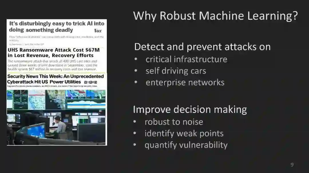 随着社会和技术日益紧密地联系在一起,威胁也越来越大。曾经孤立的威胁现在对高度相互依赖的系统构成严重担忧,这凸显了鲁棒的机器学习的基本需求。本文通过强大的机器学习的视角,贡献了新颖的工具、算法、数据库和模型,旨在研究解决网络安全和医疗领域影响数百万人的大规模社会问题。