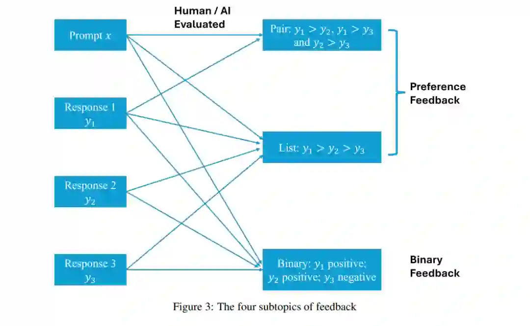 反馈包括来自人类或AI的偏好和二元响应,可以是成对或列表的形式。在本小节中,我们将讨论三个关键区别: 1. 偏好反馈与二元反馈, 1. 成对反馈与列表反馈, 1. 人类反馈与AI反馈。