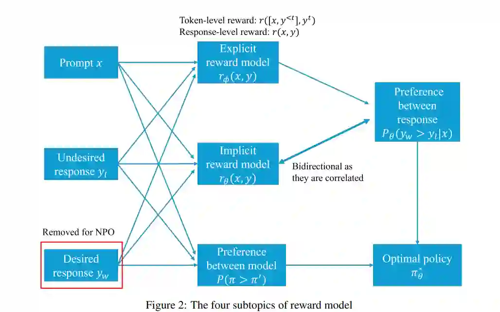 奖励模型是一个经过微调的LLM,它根据提示和生成的响应分配分数。在本小节中,我们将讨论: 1. 使用显式或隐式奖励模型, 1. 采用点对点奖励模型或偏好模型, 1. 使用标记级别或响应级别的奖励模型, 1. 仅通过负偏好训练奖励模型。