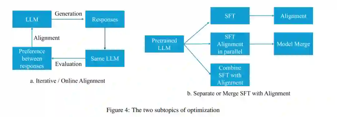 LLMs的对齐过程涉及优化。本节将讨论两个关键子主题: 1. 迭代/在线偏好优化与非迭代/离线偏好优化, 1. 分离SFT(监督微调)与对齐与合并SFT与对齐。