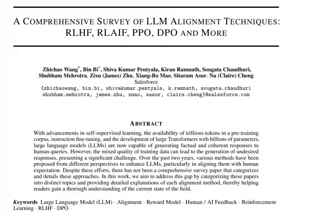 在过去的几十年中,通过自监督学习对大型语言模型(LLMs)进行的预训练取得了显著进展。这些进步得益于更大的仅解码Transformer的开发、数万亿标记的利用以及跨多个GPU的计算并行化。在预训练阶段之后,使用指令微调来指导LLMs响应人类查询。尽管取得了这些进展,但一个关键问题仍未解决:LLMs可能会生成不良响应,例如提供实施非法活动的指令。为降低这种风险,将LLMs与人类价值观对齐至关重要。从人类反馈中进行强化学习(RLHF)已成为对齐LLMs的突破性技术。这种方法促进了强大模型的发展,如GPT-4、Claude和Gemini。自RLHF引入以来,许多研究探索了进一步对齐LLMs的各种方法。然而,尚未有一篇综合性评论文章对这些对齐方法进行系统性评审。本文旨在填补这一空白,通过分类回顾现有文献并对个别论文进行详细分析。本文将我们的综述分为四个主要主题:1. 奖励模型;2. 反馈;3. 强化学习(RL);4. 优化。每个主题进一步划分为如图1所示的子主题。对于奖励模型,子主题包括:1. 显式奖励模型与隐式奖励模型;2. 点对点奖励模型与偏好模型;3. 响应级别奖励与标记级别奖励;4. 负偏好优化。关于反馈,子主题包括:1. 偏好反馈与二元反馈;2. 成对反馈与列表反馈;3. 人类反馈与AI反馈。在RL部分,子主题包括:1. 基于参考的RL与无参考RL;2. 长度控制RL;3. RL中的不同散度;4. 在线RL与离线RL。对于优化,子主题包括:1. 在线/迭代偏好优化与离线/非迭代偏好优化;2. 分离SFT与对齐与合并SFT与对齐。表1使用这些13个评价指标对所有详细回顾的论文进行了分析。