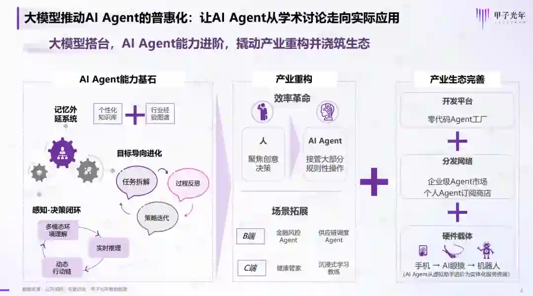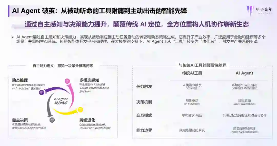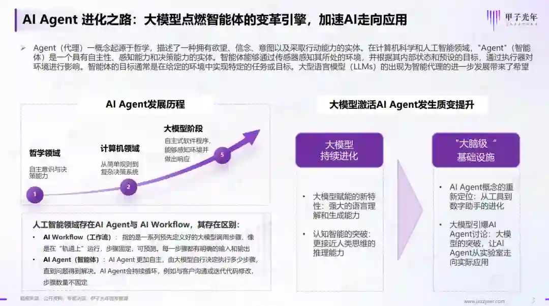 AIAgent进化之路:大模型点燃智能体的变革引擎,加速AI走向应用 Agent(代理)一概念起源于哲学,描述了一种拥有欲望、信念、意图以及采取行动能力的实体。在计算机科学和人工智能领域,"Agent"(智能体)是一个具有自主性、感知能力和决策能力的实体。智能体能够通过传感器感知其所处的环境,并根据其内部状态和预设的目标,通过执行器对环境进行影响。智能体的目标通常是在给定的环境中实现特定的任务或目标。大型语言模型(LLMs)的出现为智能代理的进一步发展带来了希望 人工智能领域存在AIAgent与AIWorkflow,其存在区别: AIWorkflow(工作流):指的是一系列预先定义好的大模型调用步骤,像是在“轨道上”运行,步骤固定,可预测。每一步骤都有明确的输入和输出 AIAgent(智能体):AIAgent更加自主,由大模型自行决定执行多少步骤,直到问题得到解决。AIAgent会持续循环,例如与客户沟通或迭代代码修改,步骤数量不固定