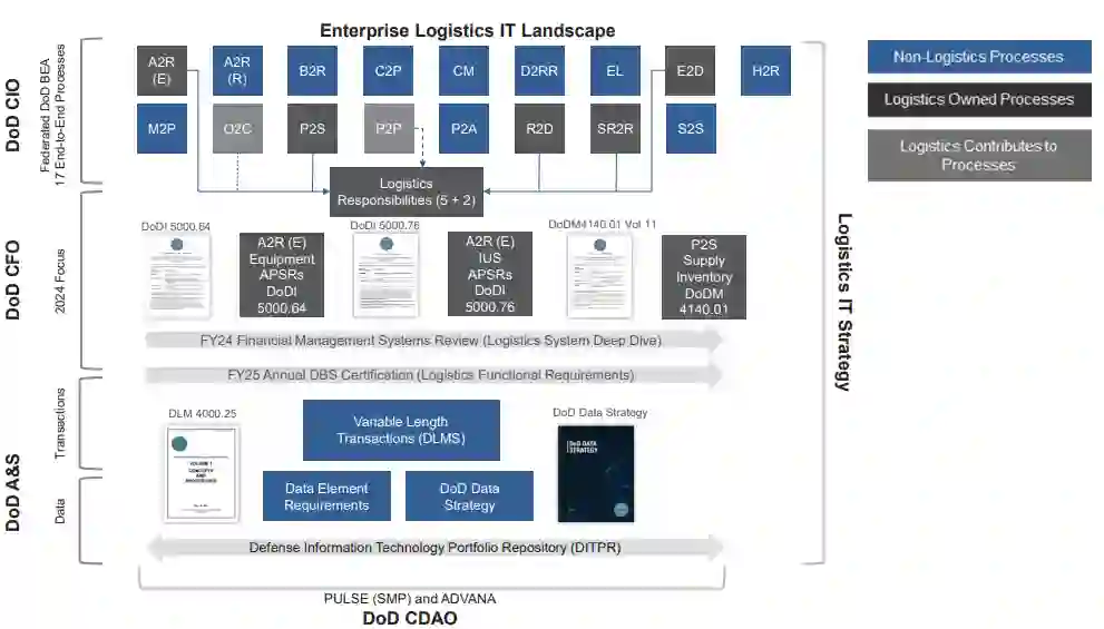 后勤信息技术战略整合了整个国防部门的需求:从联邦业务企业架构(BEA)层面到交易层面再到单个数据元素。该战略还考虑了国防部门为支持国防业务系统(DBS)认证和财务管理系统审查所做的工作。