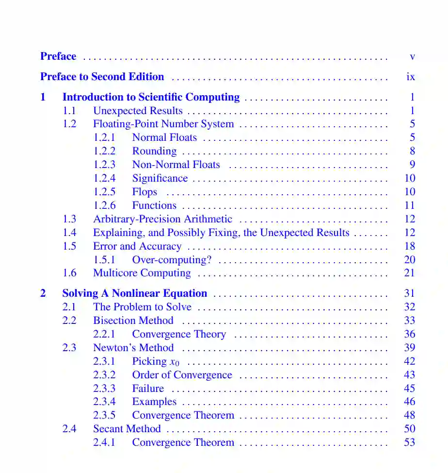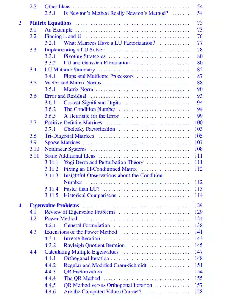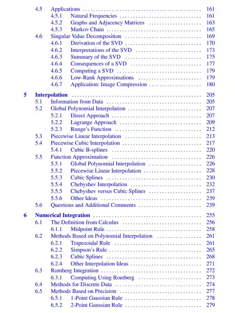 这本教材为读者介绍了数值计算及其在科学和工程中的应用。涵盖的主题包括那些通常出现在入门课程中的,以及那些在数据分析中出现的主题。这包括使用奇异值分解的优化和基于回归的方法。重点是解决问题,文中有大量关于工程和科学应用的练习。还考虑了方法背后的数学理论的基本作用,既为了理解方法是如何工作的,也为了了解计算的误差如何取决于所使用的方法。文中大部分计算示例所用的代码都可以在GitHub上找到。这个新版还包括了上级课程在计算线性代数中所需的材料。