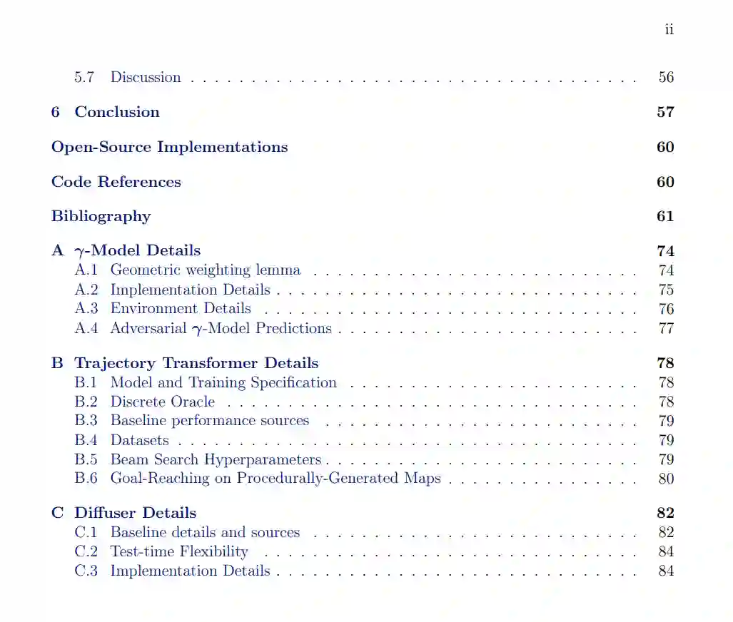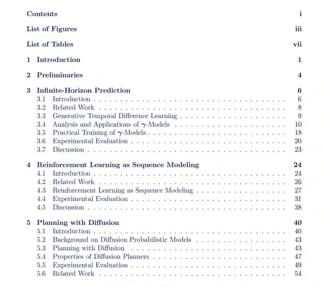 基于深度模型的强化学习方法为决策和控制问题提供了一种概念上简单的方法:利用学习来估计近似的动态模型,并将其余工作交给经典的轨迹优化。然而,这种组合在实践中存在许多实证上的缺陷,限制了基于模型方法的实用性。本论文的双重目的是研究这些缺陷的原因,并为所发现的问题提出解决方案。我们首先将动态模型进行泛化,用一个可以预测概率性潜在视野的模型替代标准的单步形式。通过时间差分学习的生成性重新解释训练出的结果模型,导致了模型基础控制的中心程序的无限视野版本,包括模型推演和基于模型的价值估计。 接下来,我们展示了常用的深度动态模型的预测准确性不佳是有效规划的主要瓶颈,并描述了如何使用高容量的序列模型来克服这个限制。将强化学习视为序列建模简化了一系列设计决策,使我们可以摒弃许多通常是强化学习算法的组成部分。然而,尽管这些序列模型的预测准确性很高,但它们受到其嵌入的搜索算法的限制。因此,我们展示了如何将整个轨迹优化管道折叠到生成模型本身中,使得从模型中采样和用它进行规划变得几乎一样。这项工作的高潮是一种方法,它通过更多的数据和经验提高其规划能力,而不仅仅是预测准确性。在此过程中,我们强调了如何将当代生成模型工具箱中的推理技术,包括束搜索、分类器引导的采样和图像修复,重新解释为强化学习问题的可行规划策略。