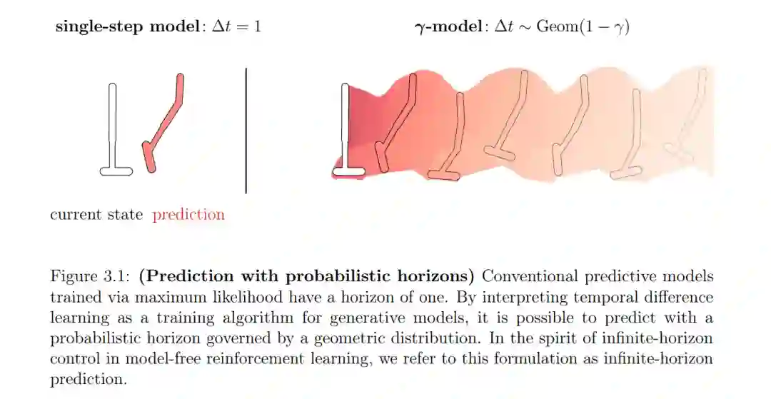 • 在第3章中,我们重新考虑了强化学习中状态空间预测的角色。结果是一个模型,它在训练时分摊预测的工作,就像一个价值函数一样,而不是依赖于基于模型的推演。因此,该模型可以在无限的概率视角下进行预测,而无需序列推演,模糊了基于模型和无模型机制之间的界线。这项调查强调了一个特别的缺点:表示未来轨迹的高维联合分布是一个困难的生成建模问题。