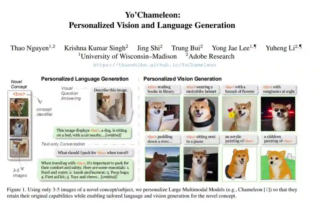 大型多模态模型(如 GPT-4、Gemini、Chameleon)已发展为拥有数百万用户的强大工具。然而,这些模型仍然是通用模型,缺乏对特定用户概念的个性化知识。尽管已有研究探索了文本生成中的个性化问题,但尚不清楚这些方法如何扩展到新的模态,例如图像生成。 本文提出了 Yo’Chameleon,首次尝试在大型多模态模型中研究个性化问题。给定某一特定概念的 3–5 张图像,Yo’Chameleon 通过软提示调优(soft-prompt tuning)嵌入主体特定的信息,以实现:(i) 回答关于该主体的问题;(ii) 重建像素级细节,在新背景中生成该主体的图像。 Yo’Chameleon 的训练过程包括: 1. 一种自我提示优化机制(self-prompting optimization mechanism),以平衡不同模态间的表现; 1. 一种**“软正样本”图像生成策略**(soft-positive image generation approach),用于在小样本条件下提升图像质量。