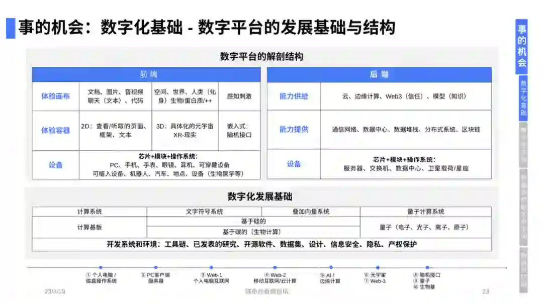 首先,底层是数字化的技术,因为数字化是人的延伸。数字化的基础里有平台,有发展基础,包括开源的代码、开源的设计、开源的数据;平台有前端、后端等。这里有大量机会。