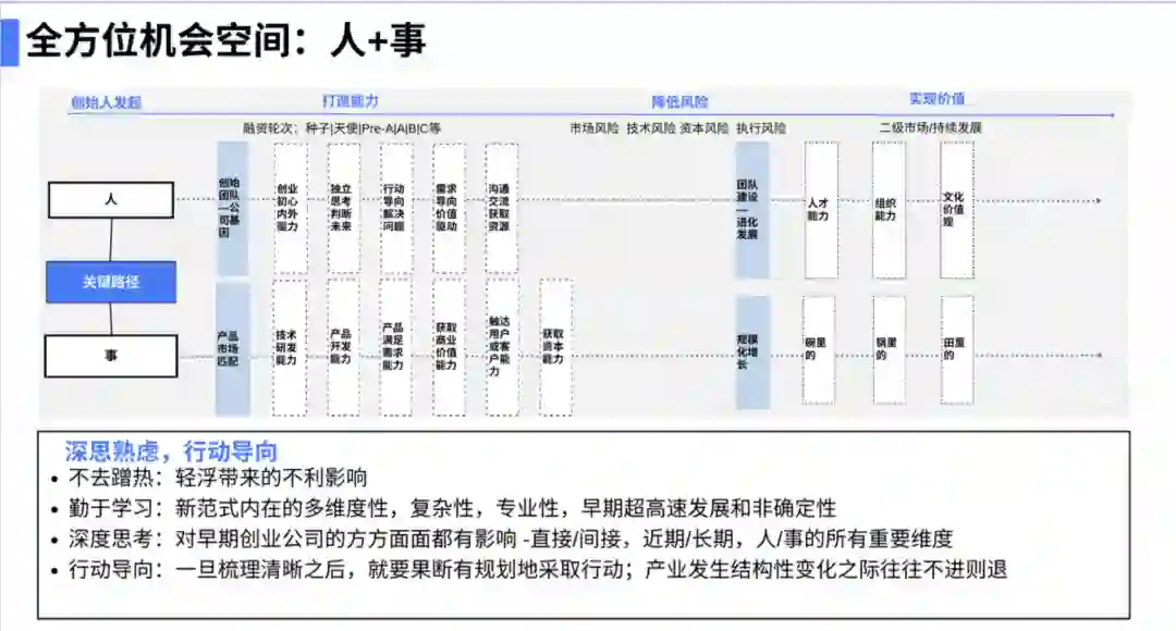 ① 首先讲创始人。**今天创始人技术能力强,好像很牛、很重要,未来真的不重要。**技术ChatGPT以后都能帮你做。**你作为创始人,越来越重要、越来越值钱的是愿力和心力。**愿力是对于未来的独到的判断和信念,坚持、有强的韧劲。这是未来的创始人越来越重要的核心素养。