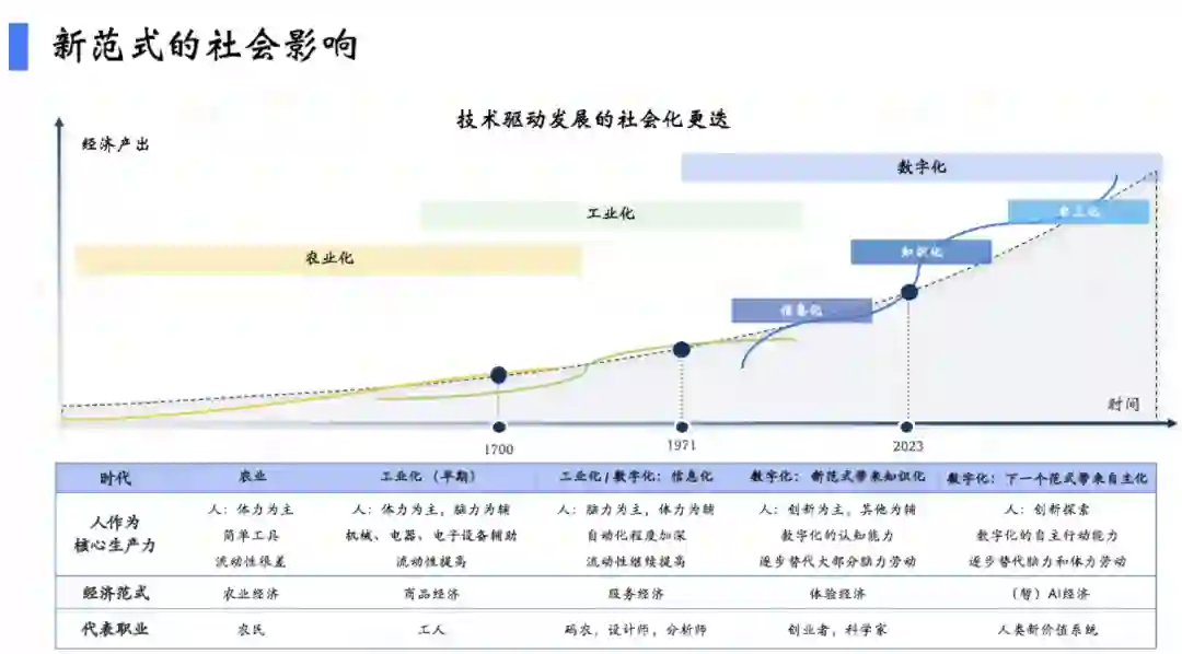 人类社会是技术驱动。从农业时代,人用工具做简单劳动,最大问题是人和土地绑定,人缺少流通性,没有自由。工业发展对人最大变化是人可以动了,可以到城市和工厂。早期工业体系以体力劳动为主、脑力劳动为辅,但随着机械化、电气化、电子化,人的体力劳动下降。信息化时代以后,人以脑力劳动为主,经济从商品经济转向服务经济——码农、设计师、分析师成为我们时代的典型职业。