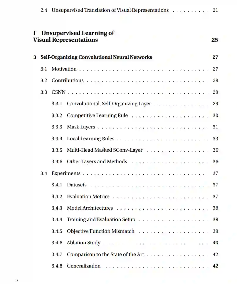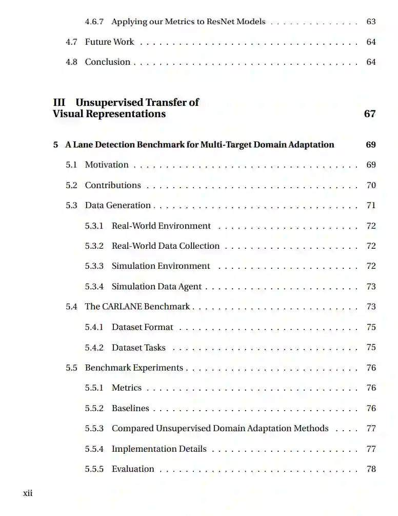无监督表征学习的目标是寻找一种方法,能够在没有注释信号的情况下从数据中学习表征。避免使用注释不仅带来经济效益,而且在一定程度上已经证明,对于表征的结构、鲁棒性和对不同任务的泛化能力方面,可以带来优势。从长远来看,由于减少了人为干预和更一般的设置,不会使优化偏向于特定注释信号的目标,无监督方法有望超越监督方法。尽管在自然语言处理中最近观察到无监督表征学习的主要优势,但在视觉领域,对于大多数任务,监督方法仍然占据主导地位。在这篇论文中,我们从三个角度为无监督(视觉)表征学习领域做出贡献:(一)学习表征:我们设计了无需反向传播的无监督卷积自组织神经网络(CSNN),它们利用自组织和Hebbian学习规则来学习卷积核和掩码,以实现更深的无需反向传播的模型。因此,我们观察到基于反向传播和非反向传播的方法可能会因无监督预处理任务和目标任务之间的目标函数不匹配而受损。这种不匹配可能导致目标任务的性能下降。(二)评估表征:我们基于广泛使用的(非)线性评估协议,定义了与预处理和目标目标无关的度量,用于衡量目标函数的不匹配。借助这些度量,我们评估了各种预处理和目标任务,并揭示了目标函数不匹配与训练和模型设置不同部分之间的依赖关系。(三)转移表征:我们贡献了CARLANE,首个针对2D车道检测的三向模拟至真实领域适应基准。我们采用了几种众所周知的无监督领域适应方法作为基准,并提出了一种基于原型跨域自监着学习的方法。最后,我们专注于基于像素的无监督领域适应,并贡献了一种内容一致的非配对图像到图像的转换方法,该方法利用掩码、全局和局部鉴别器以及相似性采样来缓解内容不一致,以及特征注意力去归一化,将基于内容的统计信息融合到生成器流中。此外,我们提出了cKVD度量,将特定类别的内容不一致纳入到感知度量中,用于衡量转换质量。