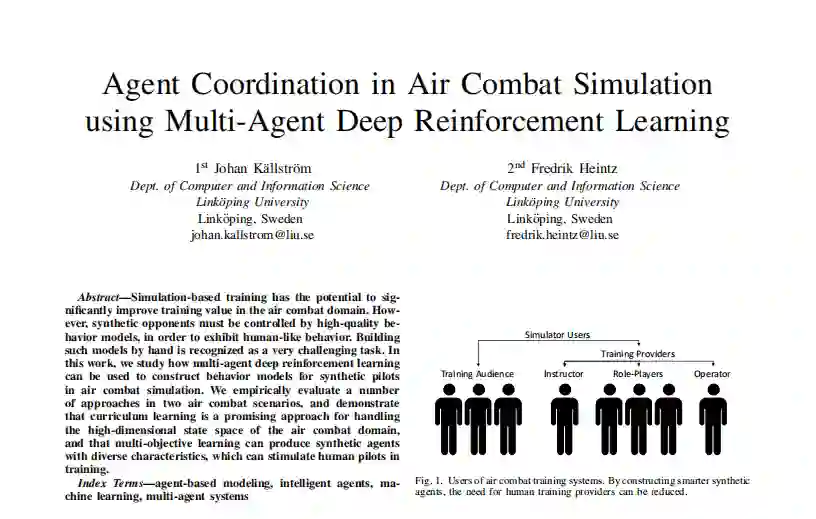 摘要--基于模拟的训练有可能大幅提高空战领域的训练价值。然而,合成对手必须由高质量的行为模型控制,以表现出类似人类的行为。手工建立这种模型被认为是一项非常具有挑战性的任务。在这项工作中,我们研究了如何利用多智能体深度强化学习来构建空战模拟中合成飞行员的行为模型。我们在两个空战场景中对一些方法进行了实证评估,并证明课程学习是处理空战领域高维状态空间的一种有前途的方法,多目标学习可以产生具有不同特征的合成智能体,这可以刺激人类飞行员的训练。