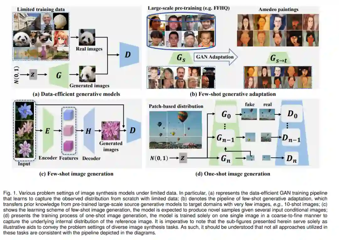 本综述关注的是训练深度生成模型在有限训练数据下生成多样化和合理的图像的方法。这些方法的主要目标是通过充分利用有限训练数据的内部信息并在数据分布范围内生成新的样本来减轻过拟合问题。然而,这些方法在模型输入、训练图和评估方面有所不同。