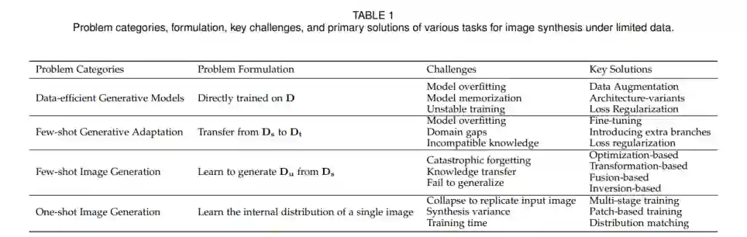 在这次调查中,我们的目标是提供关于有限数据下图像合成的各种任务的清晰理解。为了实现这个目标,我们提出了每个任务的定义和表述,考虑到每个问题背后的训练范式和任务特定的需求。我们已经构建了四个独立的问题,即数据高效生成模型、少样本生成适应、少样本图像生成和单样本图像生成。为了更好地说明这些问题,我们考虑了深度生成模型家族中的一个代表性类别,即生成对抗网络(GANs),来描绘这些问题的训练流程(见图1)。需要注意的是,所呈现的流程并不是为了代表每个任务中使用的所有方法,而是作为一个示例。此外,我们在表1中总结了每个任务的定义、模型需求和主要挑战。详细的方法设计和分类分别在相应的部分进行了介绍。