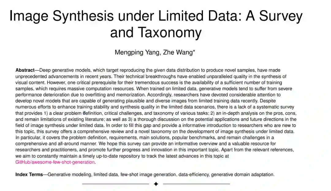 **因此,研究人员近来花费了大量的精力来开发能够从有限的训练数据生成合理且多样化图像的新型模型 **。尽管在有限数据情况下提高训练稳定性和合成质量的努力众多,但仍缺乏一个系统的调查,该调查提供1)清晰的问题定义、关键挑战和各种任务的分类;2)对现有文献的优点、缺点和剩余限制的深入分析;以及3)对有限数据下图像合成领域的潜在应用和未来方向的深入讨论。