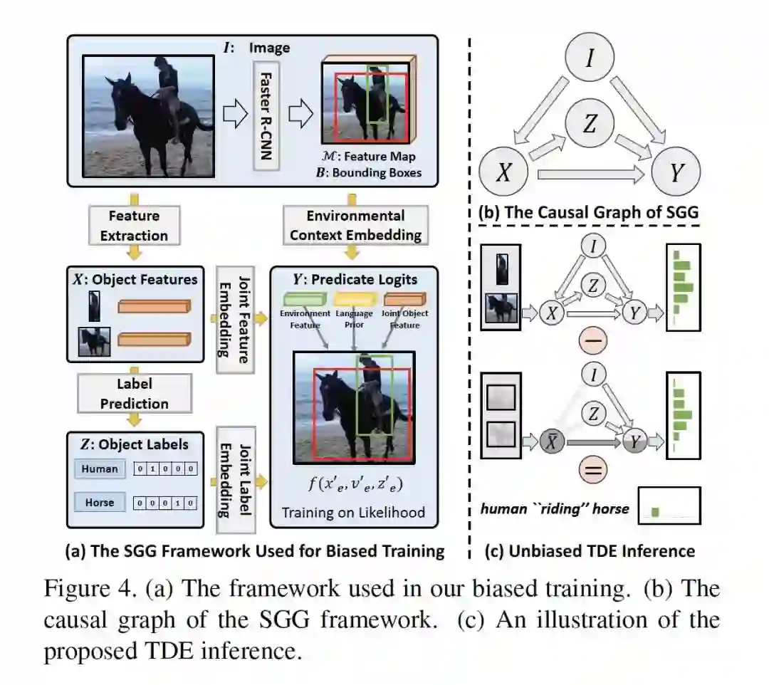 摘要:由于严重的训练偏差,场景图生成(SGG)的任务仍然不够实际,例如,将海滩上的各种步行/坐在/躺下的人简化为海滩上的人。基于这样的SGG,VQA等下游任务很难推断出比一系列对象更好的场景结构。然而,SGG中的debiasing 是非常重要的,因为传统的去偏差方法不能区分好的和不好的偏差,例如,好的上下文先验(例如,人看书而不是吃东西)和坏的长尾偏差(例如,将在后面/前面简化为邻近)。与传统的传统的似然推理不同,在本文中,我们提出了一种新的基于因果推理的SGG框架。我们首先为SGG建立因果关系图,然后用该因果关系图进行传统的有偏差训练。然后,我们提出从训练好的图中提取反事实因果关系(counterfactual causality),以推断应该被去除的不良偏差的影响。我们使用Total Direct Effect作为无偏差SGG的最终分数。我们的框架对任何SGG模型都是不可知的,因此可以在寻求无偏差预测的社区中广泛应用。通过在SGG基准Visual Genome上使用我们提出的场景图诊断工具包和几种流行的模型,与以前的最新方法相比有显著提升。