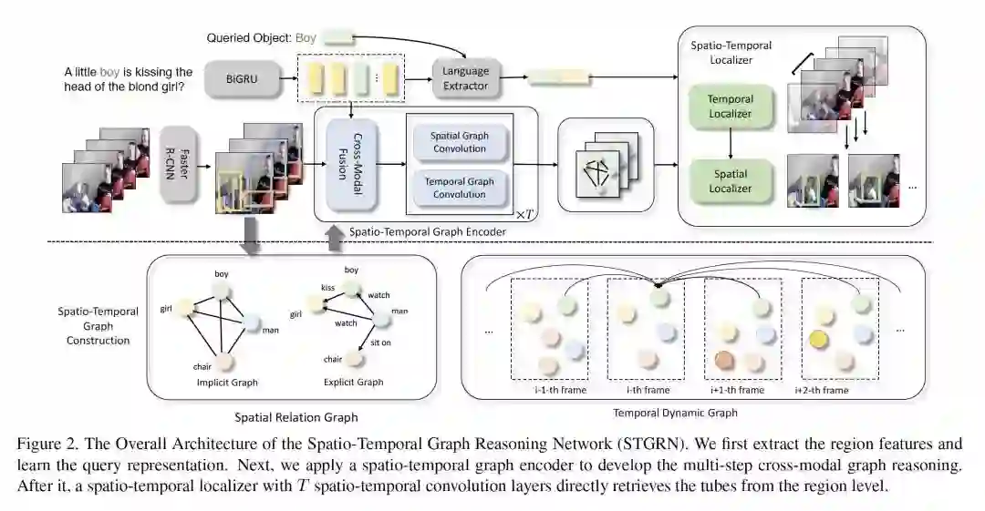 摘要:在本文中,我们考虑了一项用于多形式句子(Multi-Form Sentences)的时空Video Grounding(STVG)的任务。 即在给定未剪辑的视频和描述对象的陈述句/疑问句,STVG旨在定位所查询目标的时空管道(tube)。STVG有两个具有挑战性的设置:(1)我们需要从未剪辑的视频中定位时空对象管道,但是对象可能只存在于视频的一小段中;(2)我们需要处理多种形式的句子,包括带有显式宾语的陈述句和带有未知宾语的疑问句。 由于无效的管道预生成和缺乏对象关系建模,现有方法无法解决STVG任务。为此,我们提出了一种新颖的时空图推理网络(STGRN)。首先,我们构建时空区域图来捕捉具有时间对象动力学的区域关系,包括每帧内的隐式、显式空间子图和跨帧的时间动态子图。然后,我们将文本线索加入到图中,并开发了多步跨模态图推理。接下来,我们引入了一种具有动态选择方法的时空定位器,该定位器可以直接检索时空管道,而不需要预先生成管道。此外,我们在视频关系数据集Vidor的基础上构建了一个大规模的video grounding数据集VidSTG。大量的实验证明了该方法的有效性。