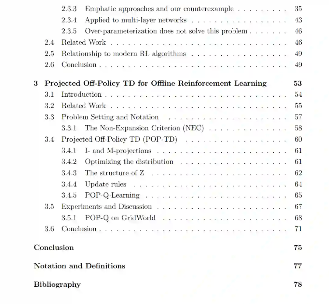 在第三章中,我们探讨了对离策略发散有抵抗力的稳定TD学习的新方法。从Kolter [24]提出的一个想法出发,我们推导出了投影离策略时序差分(Projected Off-Policy TD,POP-TD),它将TD更新重新加权为最接近的分布,该分布在其训练的固定点处是非扩张的。我们在训练循环中使用随机梯度下降学习重新加权因子(即时间和空间复杂度与学习值函数相当),然后将这些重新加权因子应用于每个TD更新。关键的是,与文献中的现代工作不同,POP-TD不会重新采样为在策略分布,而是寻找一个接近数据分布的“安全”分布。将其应用于新颖的离线强化学习示例中,我们可以清楚地演示POP-TD如何在尽量少重新采样的情况下缓解数据集和学习策略之间的分布偏移问题[30]。
