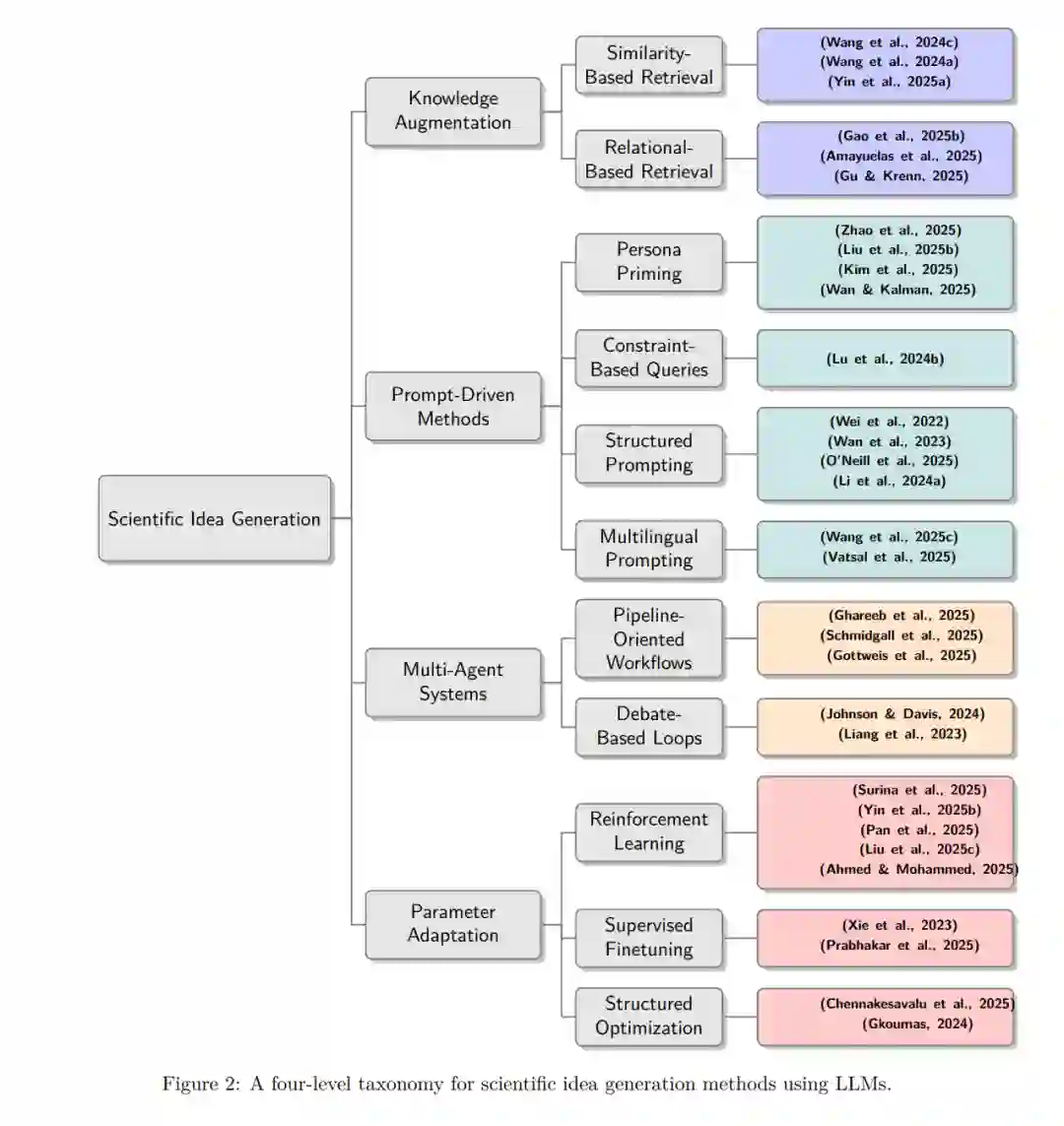 作为该视角的补充,Boden区分了创造性产出的三个层次:组合性创造力(通过对已知概念的新颖重组产生新想法)、探索性创造力(在结构化空间中进行搜索以发现新颖但在概念上连贯的可能性)以及变革性创造力(重塑或扩展概念空间本身,实现范式转换的发现)。 基于这些理论基础,本综述——不同于主要强调工程流水线、智能体架构或任务覆盖范围的现有工作——审视了LLM驱动的科学发现方法如何管理科学价值性与新颖性这双重目标。我们提出,可以通过产出创造力层次(组合性、探索性、变革性)和创造力来源(创作者、过程、环境)的视角来系统理解这些目标。我们希望认知科学的见解能帮助识别哪些维度已被涵盖,哪些尚待探索。为使此分析具体化,如图2所示,我们将现有方法归纳为五个互补的类别: 1. 知识与检索增强:这类核心工作通过整合经过筛选的、多样化的、关联性的领域知识来增强LLM,弥补静态预训练的局限性。将相关文献或事实资源纳入模型上下文,不仅使输出扎根于既定知识并减少幻觉,也充当了来自环境的创造力注入源。在Rhodes的4P框架中,这反映了环境维度,在正确性与源自已知元素重组的新颖性之间取得平衡。此类方法最有可能促进组合性创造力。我们将在第2节详述这些方法。 1. 基于提示词的分布导向:另一类方法通过输入操作引导LLM产生更具原创性的想法。此类方法主要根植于环境维度,通常产生组合性创造力,但当提示词引导探索时,也能扩展到探索性形式。第3节展示了细节及更多示例。 1. 搜索与采样扩展:推理时缩放通过迭代优化或分支探索,使LLM的能力超越了单次解码,实现了动态探索且无需额外模型训练。通过系统性地扩大创意搜索空间并超越显而易见的假说,这些方法增加了探索性创造力出现的几率,尽管正确性依赖于强大的评估信号。该方法族最贴近过程维度。我们在第4节进一步讨论。 1. 多智能体与审议系统:超越单智能体推理,多智能体系统模拟了科研团队的协作动力学。此类设置促进了超越个体极限的推理,常常涌现出跨学科边界或非常规的想法。这些动力学特性促进了批判性思维、类比推理和跳出框架的问题解决——这些正是变革性创造力的标志。这项工作凸显了过程维度,在第5节进一步讨论。 1. 参数自适应与学习:微调、强化学习和混合对齐方法直接修改模型参数,将新策略和知识内化。作用于创作者维度,随着模型将推理模式内化,接近更高级别创造性成果的可能性可能会增加。我们在第6节回归这些方法。