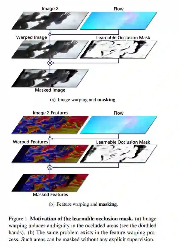特征warping 是光流估计的核心技术之一。然而,warping 过程中被遮挡区域引起的模糊性是一个尚未解决的主要问题。本文提出了一种非对称遮挡感知的特征匹配模块,该模块可以学习一种粗糙遮挡掩模,该掩模在特征warping 后立即过滤无用(遮挡)区域,而不需要任何显式监督。该模块可以很容易地集成到端到端网络架构中,在引入微不足道的计算成本的同时,还可以获得性能提升。学习后的遮挡掩模可以进一步反馈到具有双特征金字塔的后续网络级联中,从而达到最先进的性能。在提交时,我们的方法MaskFlownet超过了MPI Sintel、KITTI 2012和2015基准上所有已发布的光流方法。