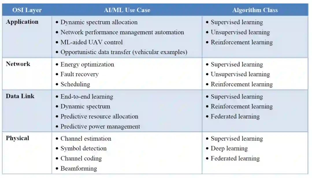 Pervasive AI 是完成这些任务的主要候选者。通过优化网络和设计新波形,人工智能和机器学习 (ML) 将作为 6G 技术的推动者发挥重要作用。讨论和研究已经集中在将 AI 应用于拟议网络的各个部分,可以通过将 AI 应用程序映射到标准开放系统互连网络层模型来最好地总结这一点。包括物理、数据链路、网络和应用程序在内的所有层似乎都是早期的研究目标。