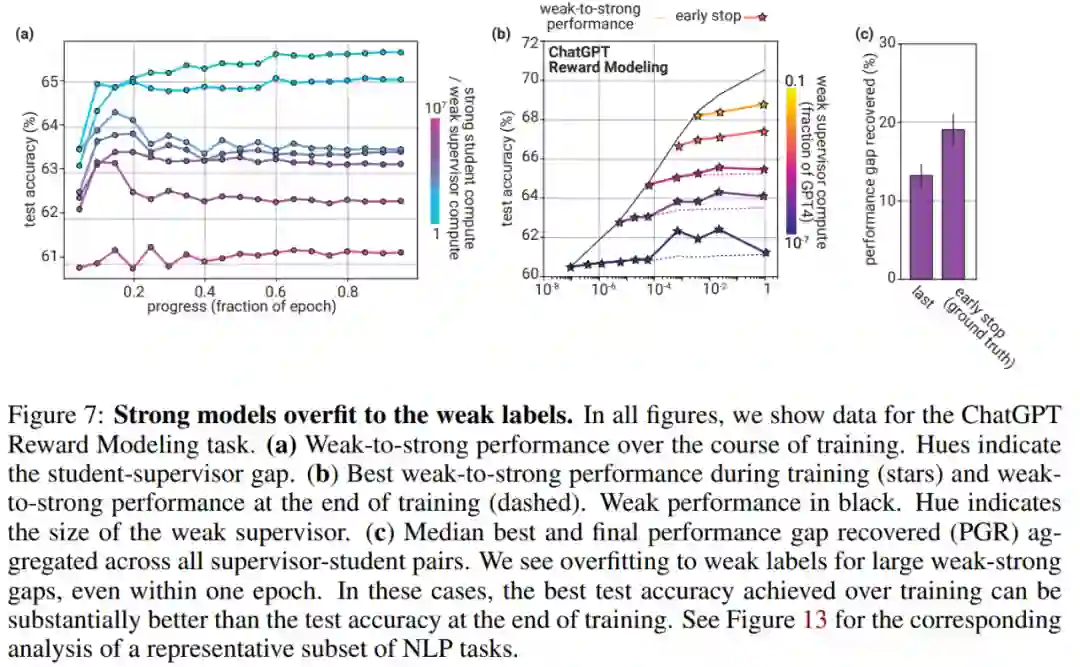 如果实现完美的弱到强泛化,则 PGR 为 1。如果弱到强模型的表现并不比弱监督者更好,则 PGR 为 0。 实验结果