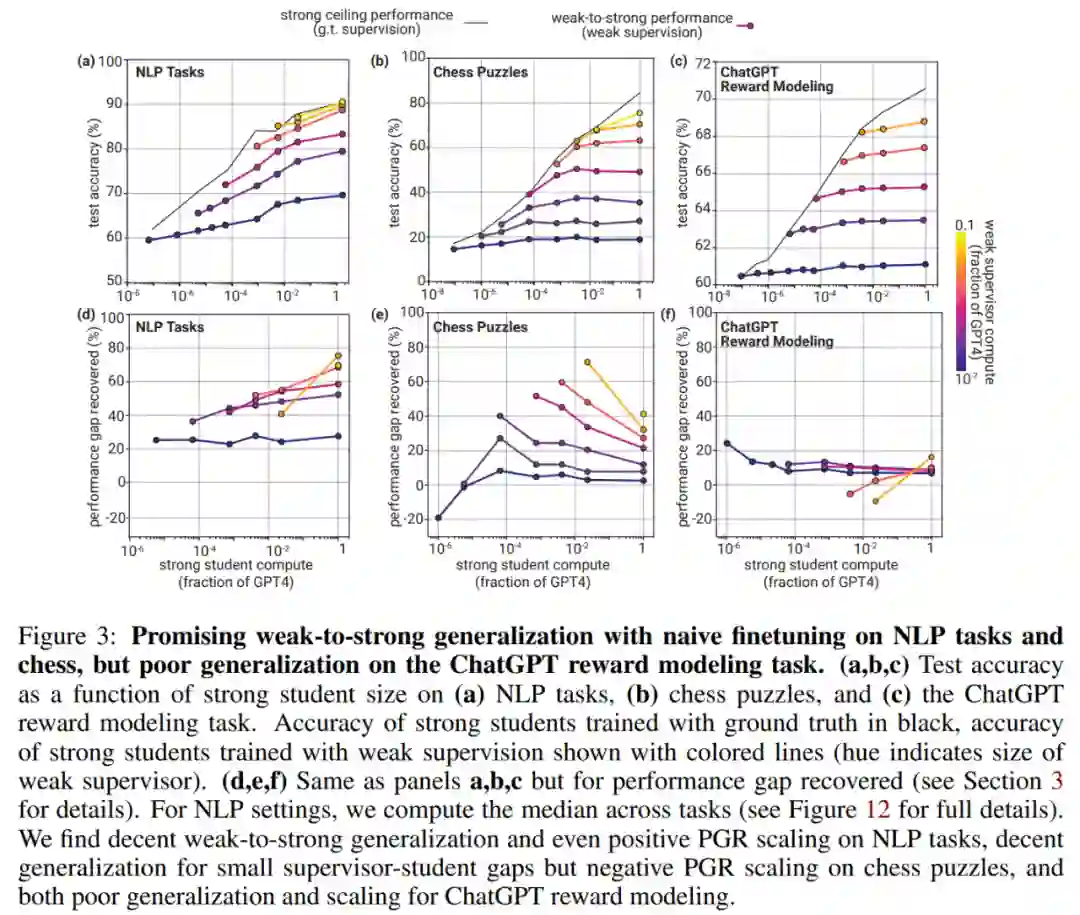 在 NLP 任务、国际象棋和奖励建模任务中,本文评估了强学生模型的表现,结果如下。总的来说,在所有的设置中,本文观察到从弱到强的泛化:强学生模型始终胜过他们的弱监督者。