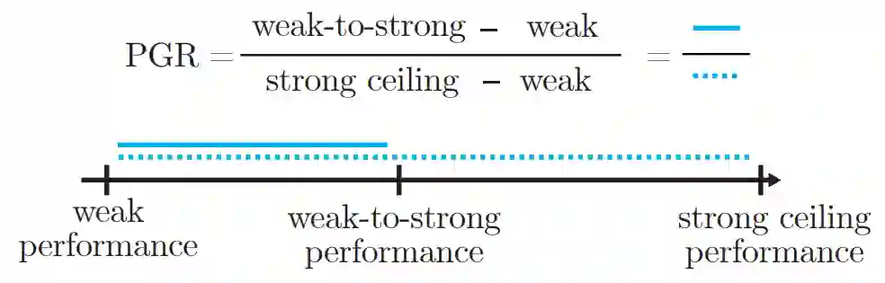 通常,弱到强的表现将介于弱表现和强上限表现(strong ceiling)之间。本文将 PGR(performance gap recovered)定义为上述三种性能(弱、弱到强和强上限)的函数,如下图所示。