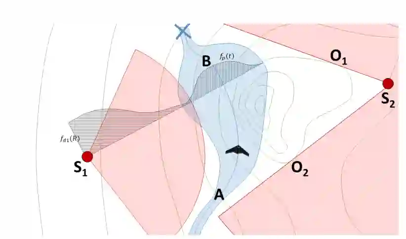 图1.1:一架无人机飞越配备两个雷达传感器(S1、S2)区域的示例。简化的探测区域以红色显示。路径周围的蓝色区域表征导航状态不确定性。检测统计量的分布与导航不确定性分别覆盖于对应区域。导航状态不确定性沿飞行路径递增,表征全局定位测量精度的衰减。