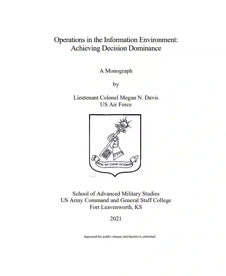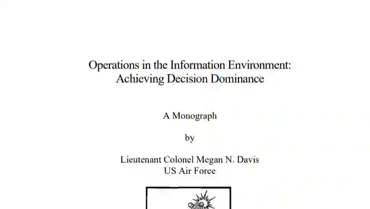 不断变化的战争特点使得信息环境中的行动(OIE)必须处于军事规划和执行的最前沿。由于无法与美国的物质力量相提并论,美国的对手越来越依赖包括信息战能力在内的不对称方法来破坏美国的行动和影响。未来的联合全域作战(JADO)将需要一个综合的、跨学科的作战方法。本文认为,针对对手的认知和信息过滤器而采取的蓄意行动将阻碍对手的决策过程,使其失去对有效运用军事力量作出明智决定的能力。通过研究俄罗斯在信息环境中的行动、信息战活动以及反射性控制理论,作者提出了决策优势理论。该理论试图提供一种方法,故意利用信息来针对对手的行为和信息系统。其目的是剥夺对手感知和认识形势的能力,并阻碍其有效利用呈现在他面前的信息来做出经过计算的决策的能力。