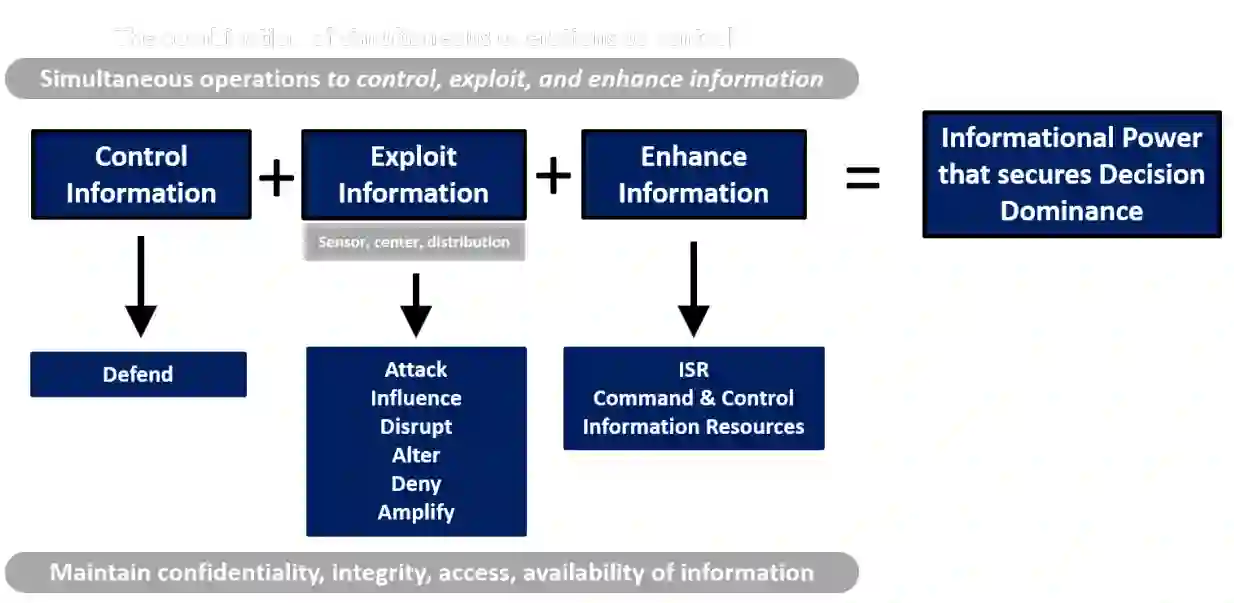 信息力量是利用信息来塑造认知、态度和其他推动预期行为和事件进程的要素的能力。信息力量涉及获取、处理、分配和运用数据的能力,以最大限度地提高战斗力。作者进一步断言,信息力量是通过控制、利用和加强信息来实现的,这使得信息战的结果能够持久、灵活和精心计算,以加强战斗力并拒绝敌人的决策优势。