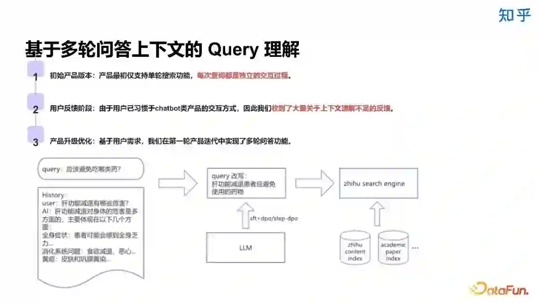 知乎直答的初始版本仅支持单轮搜索,每次查询都是一个独立的交互过程。在用户反馈阶段,我们收到了大量关于上下文理解不足的反馈。因此我们快速迭代,实现了基于多轮问答上下文的 query 理解。我们专门微调了一个模型进行 query 改写。
