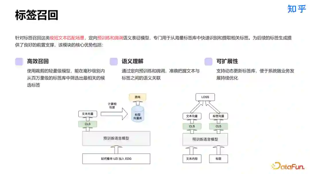 标签召回方面,我们搭建了组合式标签提取方案。将大语言模型的推理能力与传统召回技术相结合,采用两阶段策略进行标签抽取。首先通过召回模型获取内容候选标签,再利用 LLM 进行深度语义分析和标签生成,确保更全面和准确的内容标签抽取。标签召回是一种极短文本匹配场景,我们基于特定场景训练了轻量级模型,专门用于从海量标签库中快速识别和提取相关标签。该模块具有高效召回、强语义理解、高可扩展性及零样本新增标签等优势。
