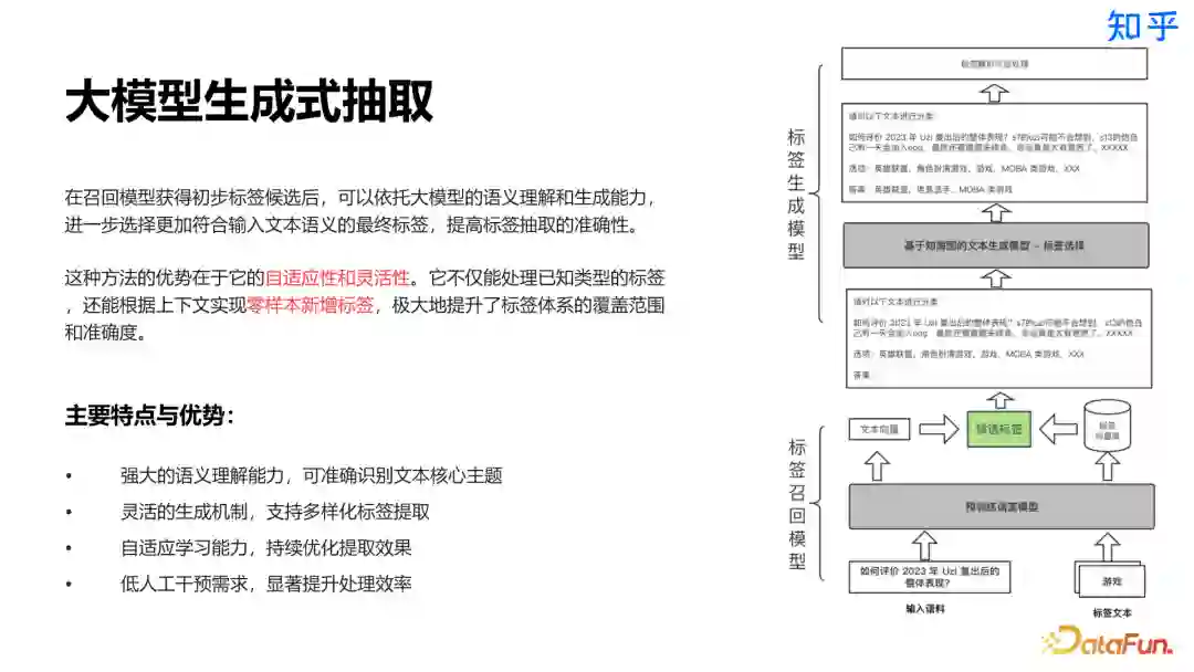 在召回模型获得初步标签候选后,可以依托大模型的语义理解和生成能力,进一步选择更加符合输入文本语义的最终标签,提高标签抽取的准确性。这种二阶段的方式具有更强的自适应性和灵活性,当需要新增标签时,可以显著提升处理效率。