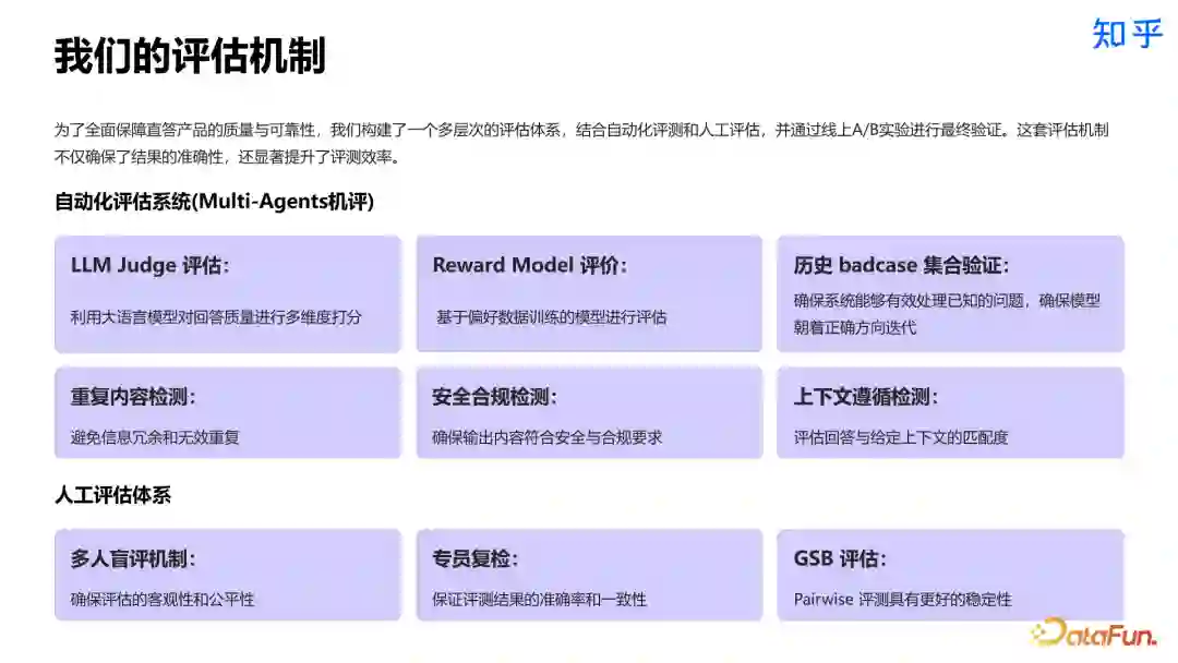 - 错误偏好:如果某个模型固定会犯某些错误,这些错误可能会在后续的评测中更容易被注意到,从而影响结果。 为了全面保障产品质量与可靠性,我们构建了一套多层次评估体系,包含自动化评估(利用大语言模型、偏好模型、历史 bad case 验证集合等多维度打分及检测相关问题)、多维人工评估(多机盲评、专员复检、GSB 评估保证客观公平、标准一致和稳定性),并且最后有 AB 实验最终确认,提升了评测效率和准确率。
