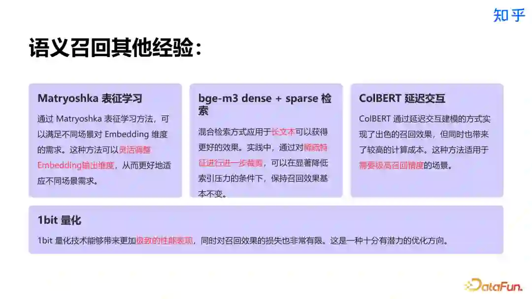 除此之外,还有其他一些语义召回方面的经验,比如 Matryoshka 表征学习,一次训练让模型具备多维度输出能力;BGE-M3 的 dense+sparse 混合检索长文表现好且能降低索引压力;ColBERT 的延迟交互方式召回精度高但成本高,适用于高精度要求场景;1bit 量化能提升性能且召回效果损失小,具研发潜力。