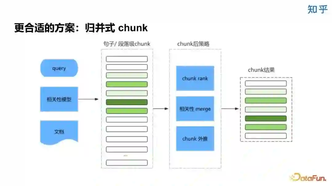 下图展示了大致的流程,对于候选 chunk 会进行细粒度的切分,之后用相关性模型对这些 chunk 和 query 的相关性进行打分,再进行 rank、merge 和外推,最后对每一个文档仅生成一个 chunk。 ![]()