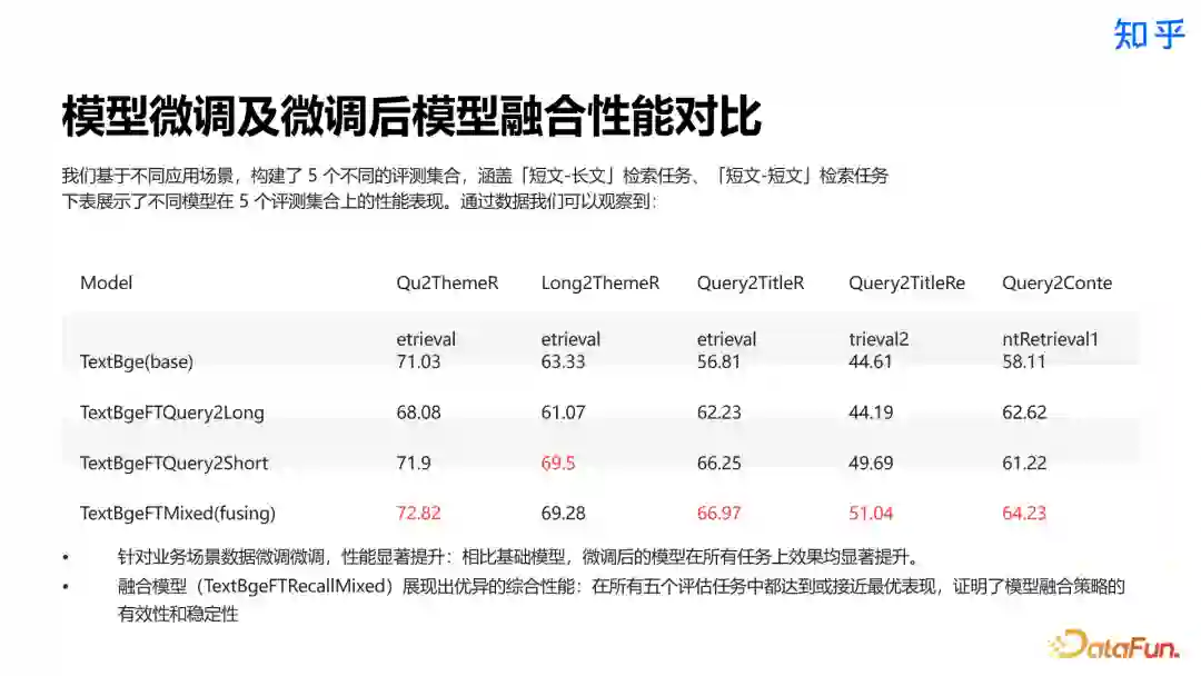 下图给出了一组评测数据,其中五列为五个不同的评测任务,包括短文到长文的检索、短文到短文的检索等。可以看到 TextBgeFTQuery2Long 模型在长文检索上有显著优势,TextBgeFTQuery2Short 模型在短文检索上优于其它模型,而融合后的 TextBgeFTMixed 在几乎所有任务上都有着非常好的表现,这充分说明了模型融合的有效性。