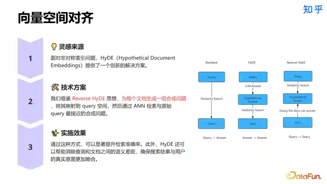 向量空间对齐的工作旨在解决非对称索引问题,通过对文档理解构建合成标题索引,实现 query 到 query 的检索使训练空间对齐,提升检索准确率。