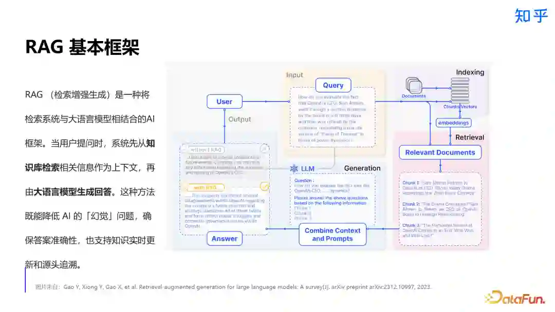 实践经验分享****在这一章节中,将分别对 query、retrieval、chunk、rerank、generation 和 evaluation 这些环节展开介绍,并分享性能优化实践。 1. 检索增强生成(RAG)框架检索增强生成(RAG)是一种将检索系统与大语言模型相结合的 AI 框架。用户提问时先检索知识库,将结果作为大模型上下文生成答案。这种方法可以很好地减少 AI 幻觉问题,确保答案的准确性,并且具备溯源性与更好的可解释性。