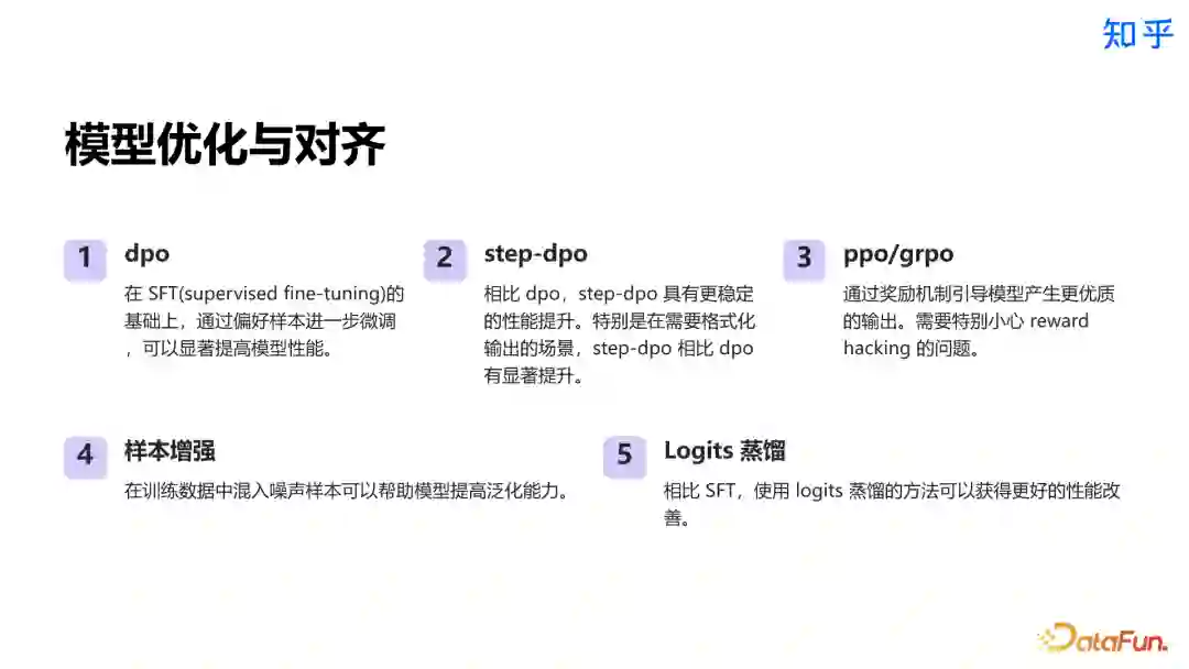 生成过程的模型优化:采用 DPO、step-DPO、PPO、GRPO 等对齐训练方式提升模型效果,注意强化学习方案问题;通过样本增强、拉齐等手段改善性能。 ![]()