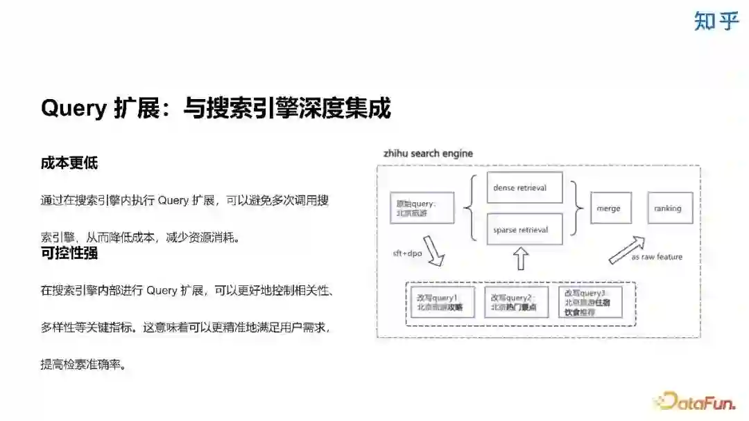 我们将 query 扩展与搜索引擎进行了深度结合,从而降低了成本,并且增强了可控性。因为 query 扩展放到了搜索引擎内执行,所以可以避免多次调用搜索引擎,这样既减少了资源消耗,又可以更好地控制相关性、多样性等关键指标,以提高检索准确率。我们定向训练了一个模型来完成 query 扩展任务。