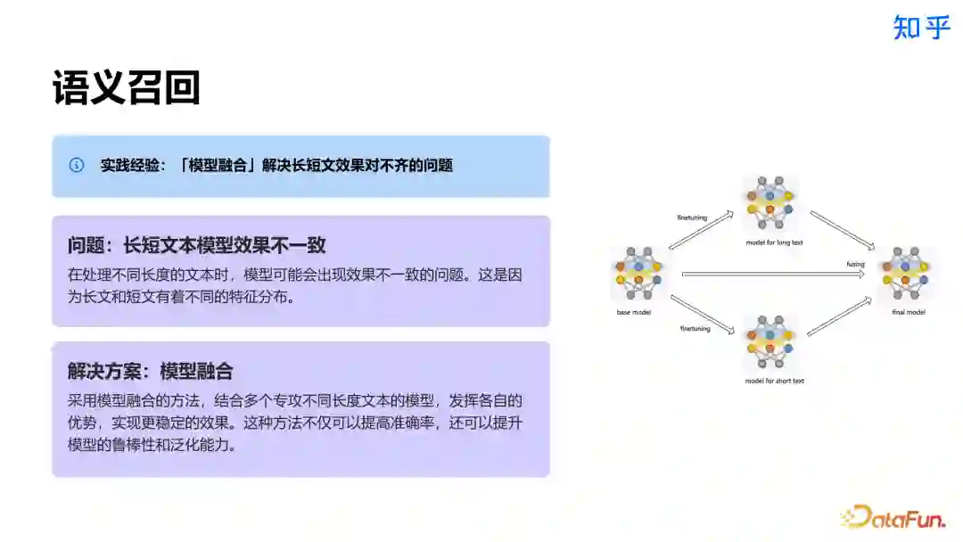 3. 召回方案知乎直答采用了多策略召回方案,包括语义召回、标签召回,以及在语义召回基础上的向量空间对齐。语义召回方面,基于知乎问答场景数据深度调优 BGE Embedding 模型,以提升检索质量。针对不同任务(如检索、语义相关性、聚类分类等)调优损失函数,采用不同损失函数并调整负采样策略等提升效果。