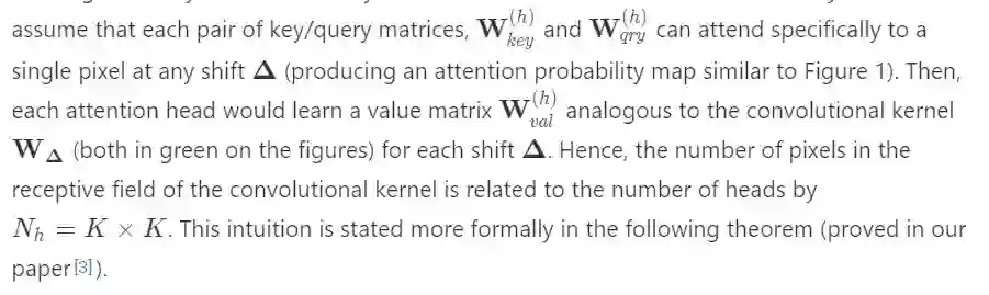 Self-attention对文本处理产生了很大的影响,并成为自然语言理解NLU的不可缺少的构建模块。但是这种成功并不局限于文本(或者一维序列)——基于transformer的架构可以在视觉任务上打败最先进的ResNet技术[1,2]。为了解释这一成果,我们的工作[3]表明,self-attention可以表达CNN层,这种卷积滤波层是在实际任务中得到。我们提供了一个互动网站来探索我们的结果。