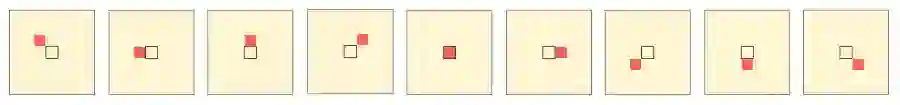 图1: 9个头的一个查询像素(黑色中心正方形)的注意力得分(单独标绘)。如果在每个查询像素上,每个注意力头都能在任意的移动中注意到单个像素(红色)会怎么样?然后,自注意层可以表示一个大小为3×3的卷积滤波器……我们证明了多头自注意层有能力表现这种模式,并且这种行为是在实际中学习得的。多头自注意是卷积层次的泛化。