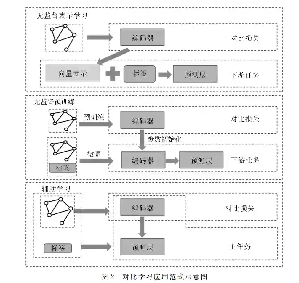 对比学习是一种判别式的学习方法,其目的是 让相似的样本学到相近的表示,同时让不相似样本 的表示互相远离。对比学习在文本[19]、语音[20]、图 像[21-25]等领域取得了显著的效果提升,受到了广泛 关注。对比学习在这些领域取得成功,为研究者设 计图对比学习的框架打下了坚实的基础。 图对比学习期望学到一个编码模型,使得相似 的节点(图)经过编码模型后得到相似的表示,不相 似的节点(图)得到差异较大的表示。现有的方法可 以总结成一个统一的框架,如图1所示,首先定义正 负例并利用正例生成器和负例生成器分别得到正负 样本。接着将这些样本输入到编码模型后得到对应 的表示。最后设计一个将正负样本表示区分开的损 失函数,进行参数优化。 目前的图对比学习方法在设计时主要关注:① 正负例的定义与产生方式;②编码模型的架构;③损 失函数的形式。我们在图1中用虚线框出了这三 部分。应用图对比学习的典型范式如图2所示,包括 无监督表示学习、无监督预训练、辅助学习三种方 式[6]。其中,无监督表示学习和无监督预训练是两 阶段的训练范式,辅助学习是一阶段联合优化的训 练范式。无监督表示学习利用对比学习为每个节点 (或图)学习向量表示。接着固定这些表示作为输入 去训练模型解决下游任务。无监督预训练范式,同 样先用对比学习无监督地学习一个编码器。但在解 决下游任务时,不仅利用标签信息更新预测层的参 数,同时也微调编码器的参数。辅助学习范式是指 在主任务损失函数的基础上添加对比学习损失作为 正则项,联合优化这两项损失函数进行参数更新。