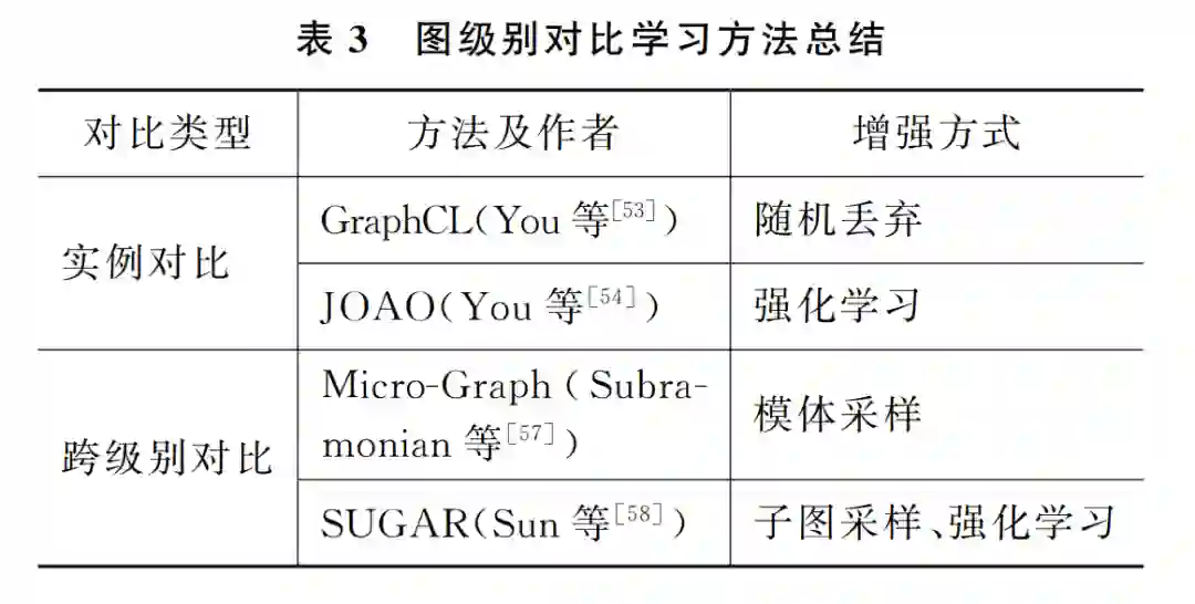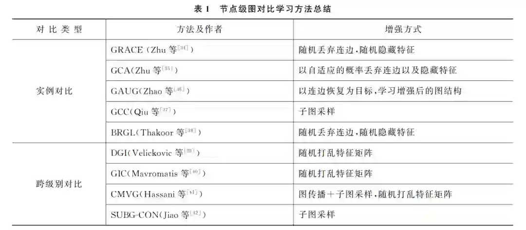 正负例 的 定 义 是 现 有 的 图 对 比 学 习 方 法 关 键,不同的定 义 方 式 需 要 不 同 的 编 码 模 型 和 损 失 函数。根据对比类型可以将现有方法分成实例对 比和跨级别对比两类。实例对比是指同一个样本 的不同增强 样 本 之 间 的 对 比,跨 级 别 对 比 是 指 不 同 级 别 对 象 之 间 的 对 比,例 如,节 点 级 对 象 和 子 图级对 象 的 对 比。 同 时,对 于 每 一 个 模 型,将 从 正负例的 定 义 与 产 生 方 式 以 及 损 失 函 数 的 形 式 两个方 面 进 行 介 绍。 表 1 总 结 了 本 节 介 绍 的 图 对比学习框架,并且 对 比 了 不 同 模 型 使 用 的 增 强 方式。