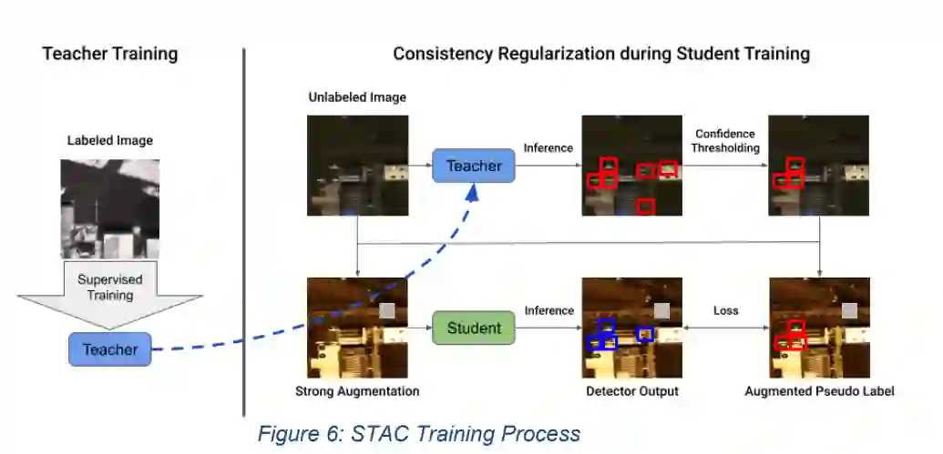 自我训练和一致性正则化的结合是在这个项目中研究的最有希望的方法。研究了STAC方法作为第三年评估的目标检测系统。内部结果显示,这两种技术的结合可以用于合成到真实领域的适应性,也可以更普遍地用于地理空间应用。此外,还表明,在地理空间数据集中,为一致性正则化而对空图像进行伪标签的做法对STAC产生了好处。在第三年的评估中,假标签空图像的显著优势未能得到测试,因为这些数据集不包含任何图像,即所有的图像至少包含一个感兴趣的目标。
